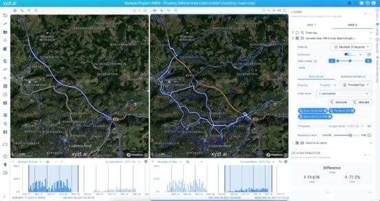 xyzt.ai is purpose-built for floating vehicle data analytics. It is the only platform that natively supports all forms of floating vehicle data - raw GPS traces, map-matched trip paths, and aggregated traffic volumes and statistics - while ensuring privacy and data protection by design. Analyze traffic flow, mobility patterns, and road network performance at scale, without compromising on privacy.