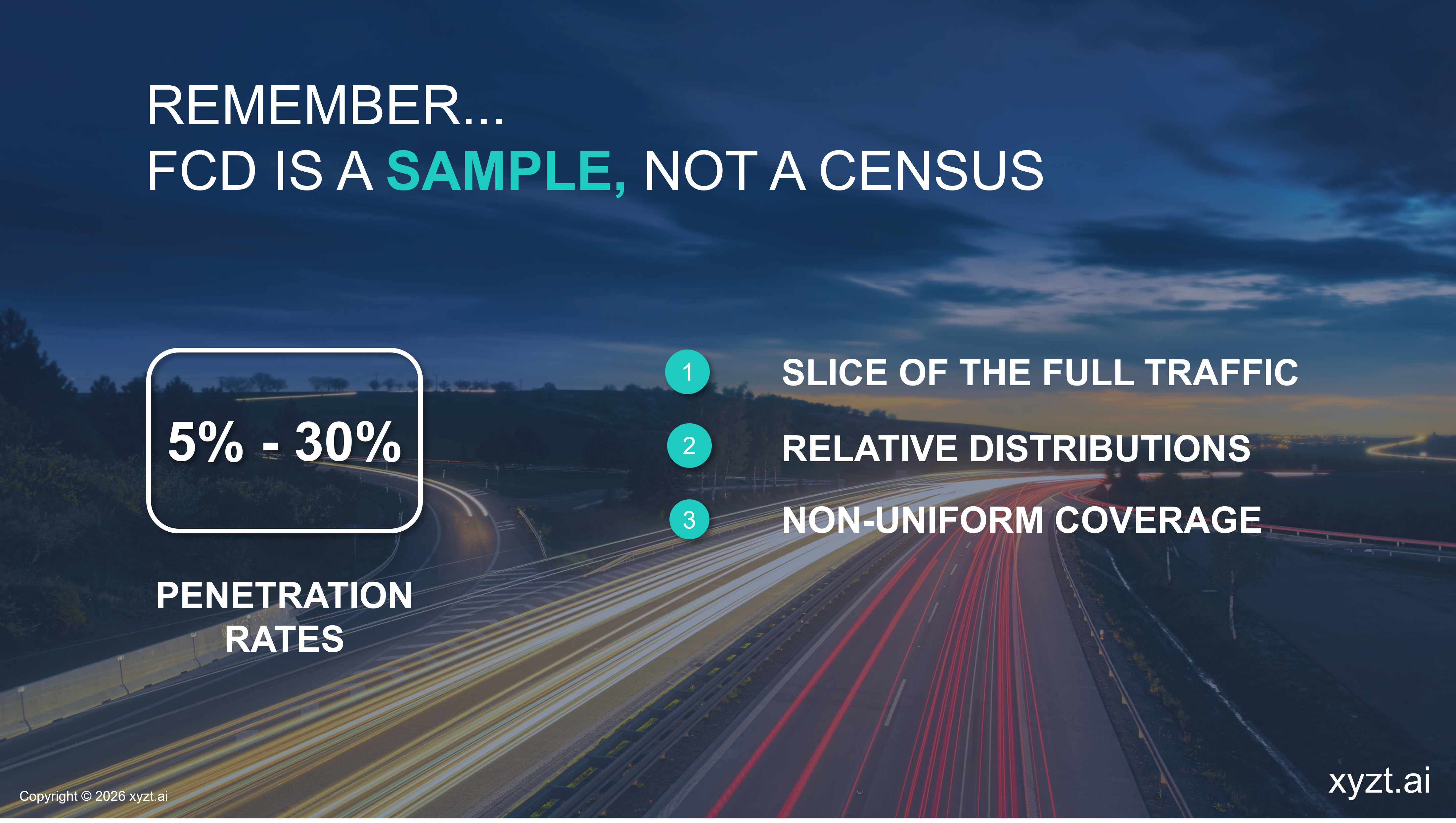 A critical concept in floating car data analytics is that the data represents a sample of traffic, not a complete census.