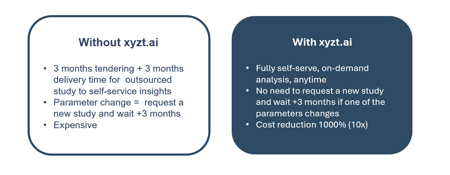 A federal motorway company in Germany faced significant hurdles in its urban planning and policy work. To conduct essential traffic and mobility studies, they were dependent on external consulting firms. This process was not only costly, with small studies costing €50,000 and large ones €100,000, but it was also incredibly slow. Each study required a lengthy 6-month throughput time—three months for the tender process and three months for the consultant to complete the work. Furthermore, the agency had limited ability to verify or modify the final results, which could lead to critical insights being overlooked.
